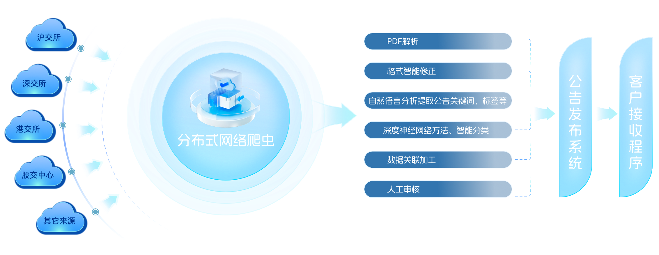 從公告發布時間開始,我們對一篇報告的下載、智能處理、審核、發布到客戶的全部時間一般在5分鐘之內